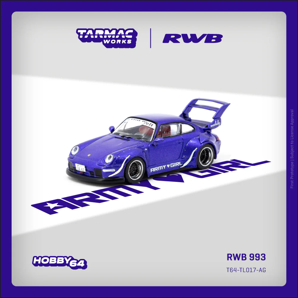 Esta edición Tarmac Works HOBBY64 1/64 en versión “ARMY GIRL” destaca por su propuesta gráfica tipo militar/crew, con una estética llamativa y diferente dentro del universo RWB. Una pieza perfecta para colecciones JDM/Euro modificadas y para vitrinas enfocadas en tuning premium.